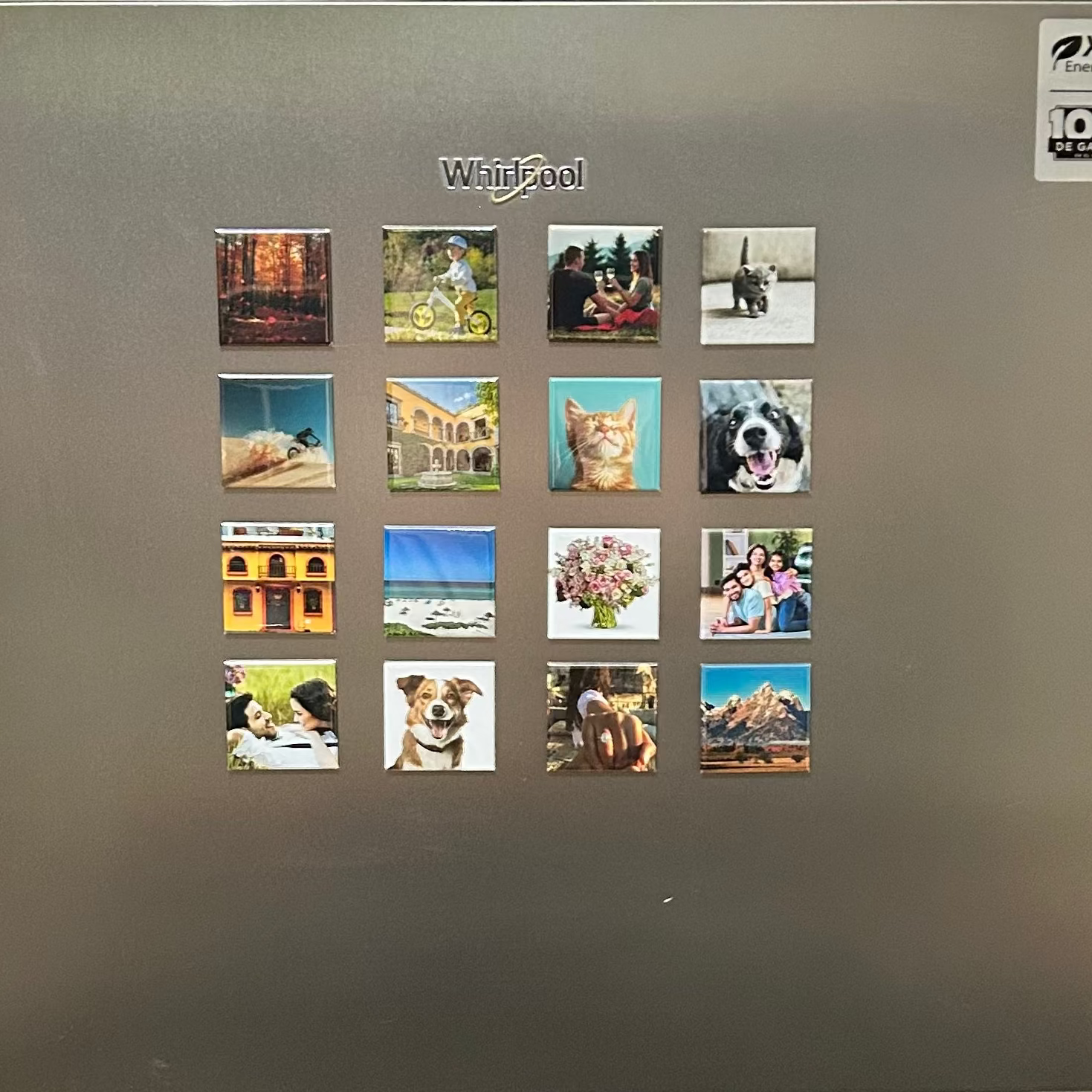 Recuerda que el iman es de 5 x 5 cms, esto significa que las fotografías tendrás que subirlas en un aspecto de 1:1, nuestra aplicación te ayudará a ajustarlas a esas medidas.